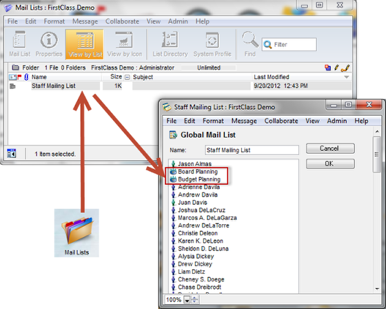 Upon opening the newly populated Global Mail List, we see that there is a problem. The list also includes conferences that belong to this group.