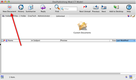 The new document button on the toolbar may be hidden off to the right of the toolbar so you may have to widen the window to see it. We can move the button all the way to the left and remove the existing New button.
