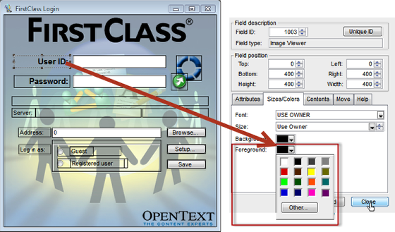 Click on the Size/Colors tab and set the Foreground color for the field.