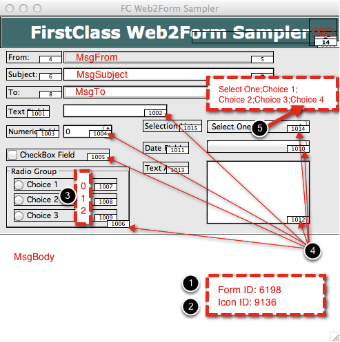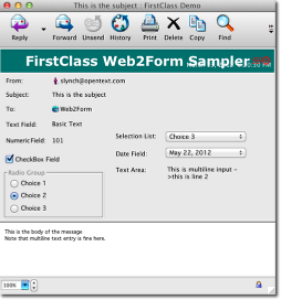 The message envelope will support the following different types of FirstClass fields when submitted via a form and perl script generated by the Web2Form application.