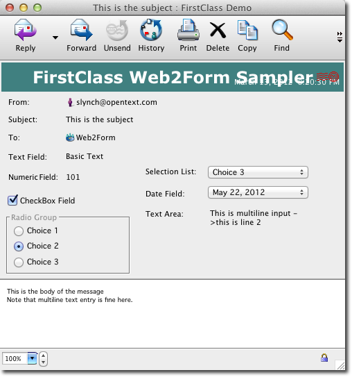 Log in to your FirstClass Server and verify the the message has been delivered with all fields being displayed correctly.