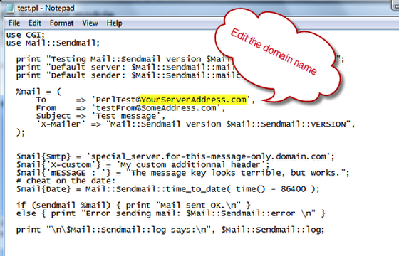 To test your install of Perl and of the Sendmail module, you can modify and test the test.pl perl script that is provided in the support files folder.