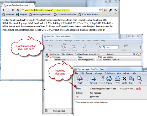 - A sample email should arrive in the PerlTest conference and confirmation of a successful implementation of the sendmail module should appear in your browser.