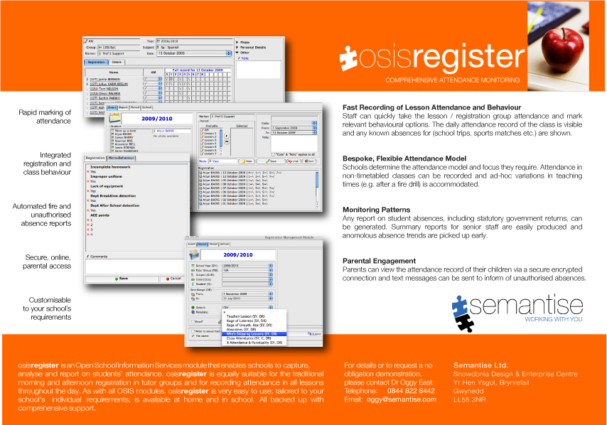 osisregister is an Open School Information Services module that enables schools to capture, analyse and report on students’ attendance. osisregister is equally suitable for the traditional morning and afternoon registration in tutor groups and for recording attendance in all lessons throughout the day. As with all OSIS modules, osisregister is very easy to use; tailored to your school's individual requirements; is available at home and in school. All backed up with comprehensive support.