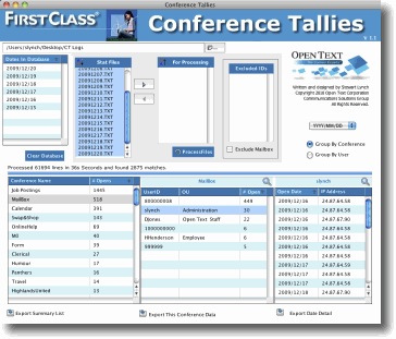 The FirstClass Conference Tallies application asks you to load your Statistics files and then summarizes all Open Conference and optionally Open Mailbox actions for all users over the analyzed period.