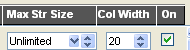 Max Str Size, Col Width and On Leave Max Str Size as Unlimited for all fields and set the Column Width to what you think is appropriate for the selected type of field. I find that for small icon fields, 20 is a good width. As for other fields, you will have to experiment. Finally, to have the custom column appear you must click on the On checkbox. |